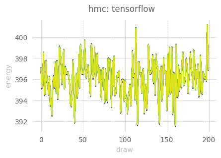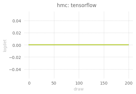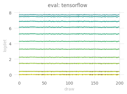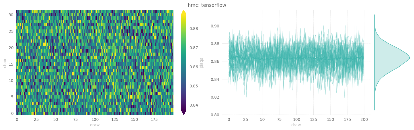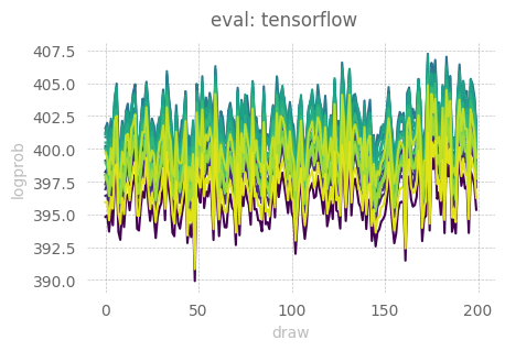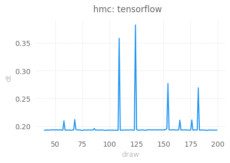 - draw (draw) int64 110 111 112 113 114 115 … 194 195 196 197 198 199 dQint.sum(): <xarray.DataArray ‘dQint’ ()> array(1527) TensorFlow, HMC dQint.sum(‘chain’): <xarray.DataArray ‘dQint’ (draw: 90)> array([ 8, 5, 9, 7, 14, 16, 12, 12, 15, 12, 10, 13, 13, 12, 8, 13, 12, 3, 11, 12, 7, 12, 10, 6, 8, 16, 8, 17, 8, 9, 7, 1, 10, 12, 13, 11, 21, 15, 11, 11, 7, 10, 6, 6, 13, 7, 8, 9, 11, 5, 12, 15, 13, 10, 6, 10, 6, 8, 7, 6, 11, 12, 12, 13, 7, 16, 8, 10, 14, 17, 11, 11, 13, 9, 9, 11, 9, 11, 13, 9, 11, 9, 7, 4, 6, 7, 10, 12, 17, 14]) Coordinates: