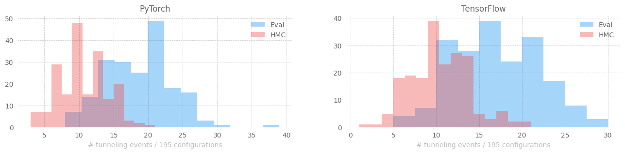 where the difference is between subsequent states in a chain, and the sum is over all chains (each being ran in parallel, independently). Since our goal is to generate independent configurations, the more our sampler tunnels between different topological sectors (tunneling rate), the more efficient our sampler.