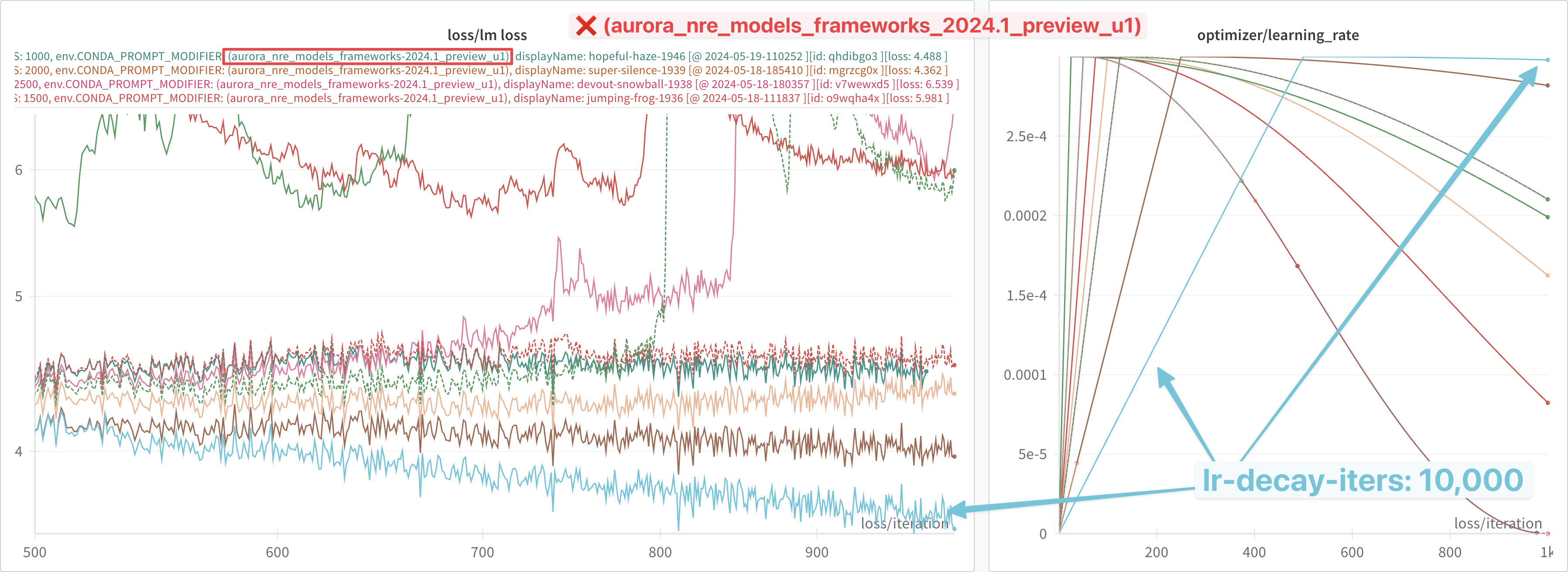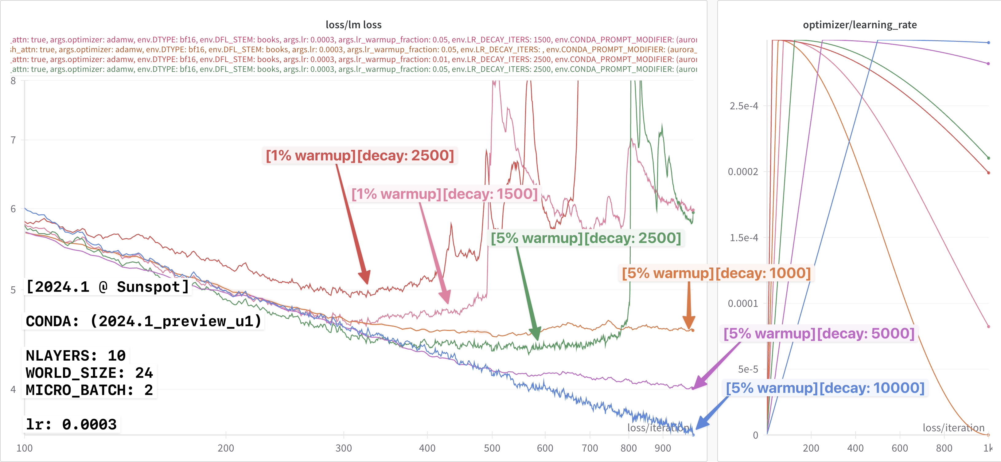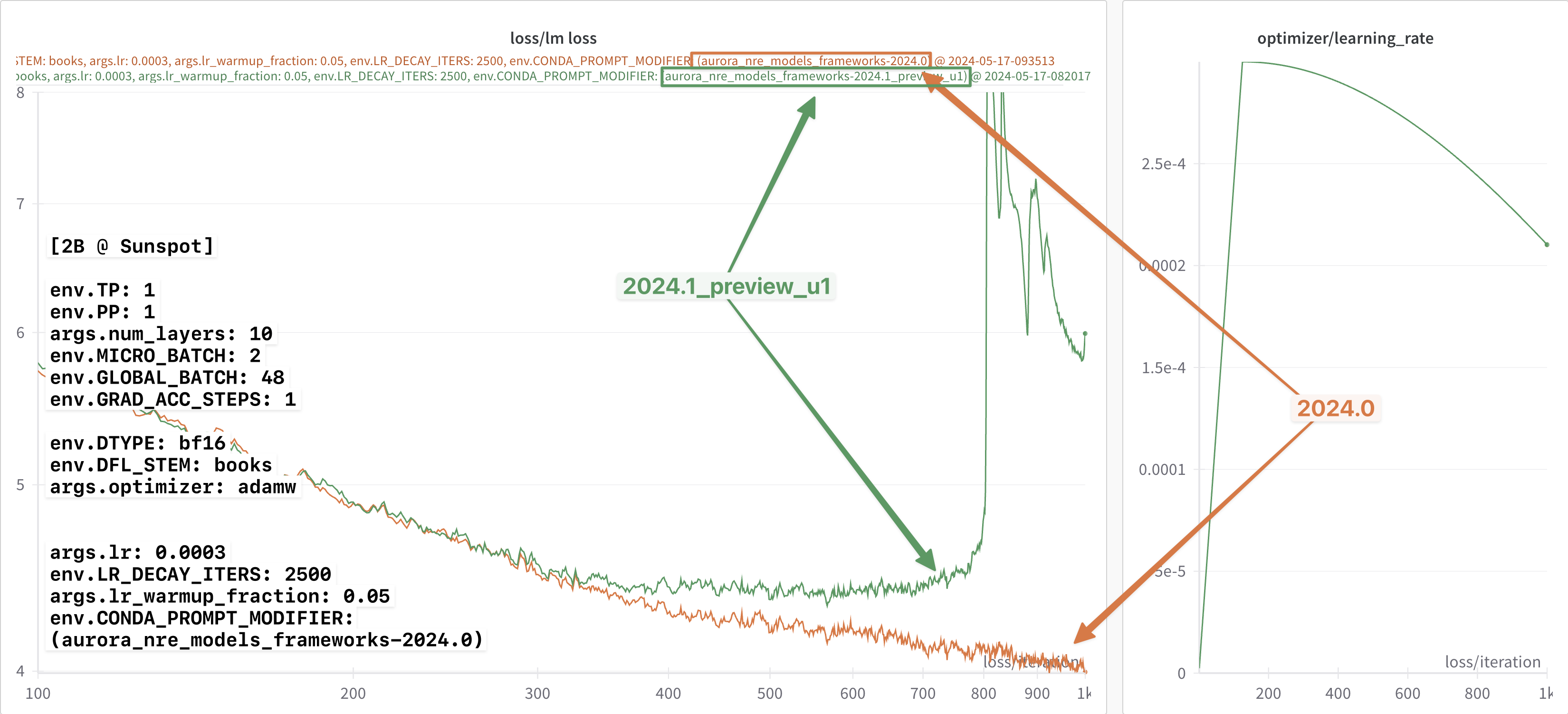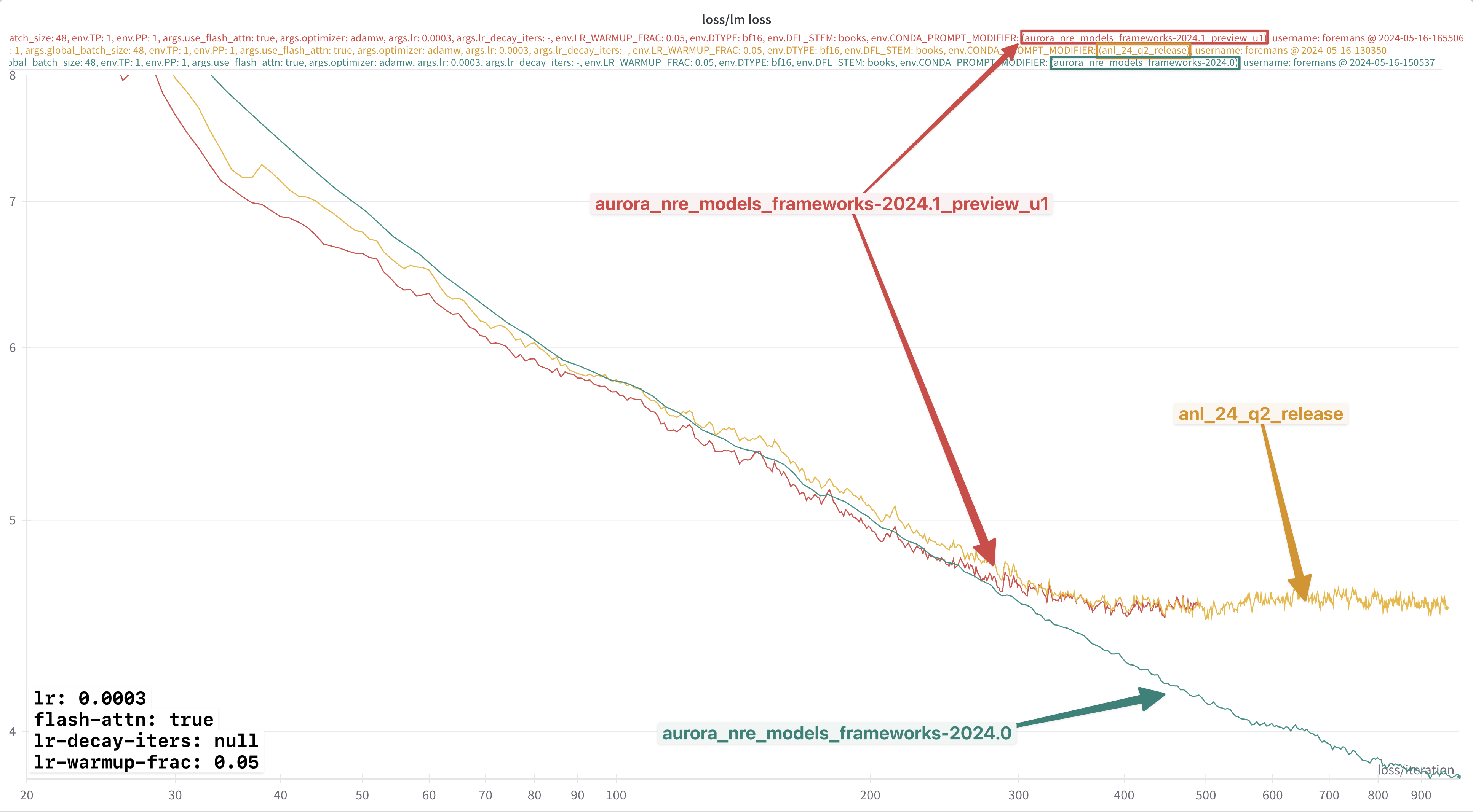 An additional source of confusion for me was that the discrepancy in the loss curves (seemingly) disappeared when using the learning rate settings provided by Intel4, but not when using the ALCF defaults5.