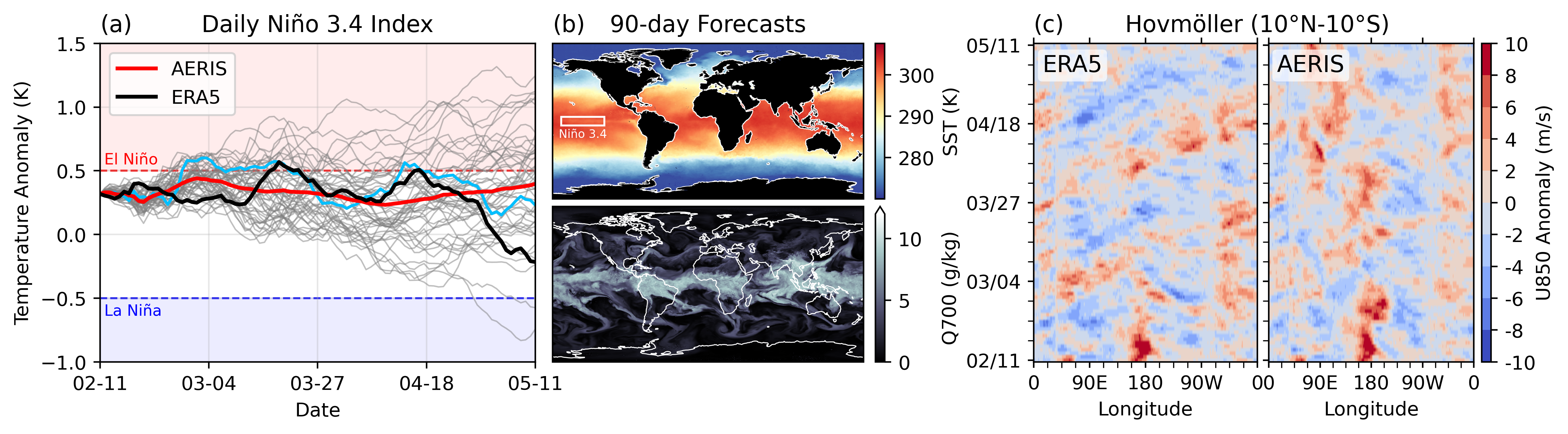 closest ensemble member to the ERA5 in (a); and (c) stable Hovmöller diagrams of U850 anomalies (climatology removed; m/s), averaged between 10°S and 10°N, for a 90-day rollout.